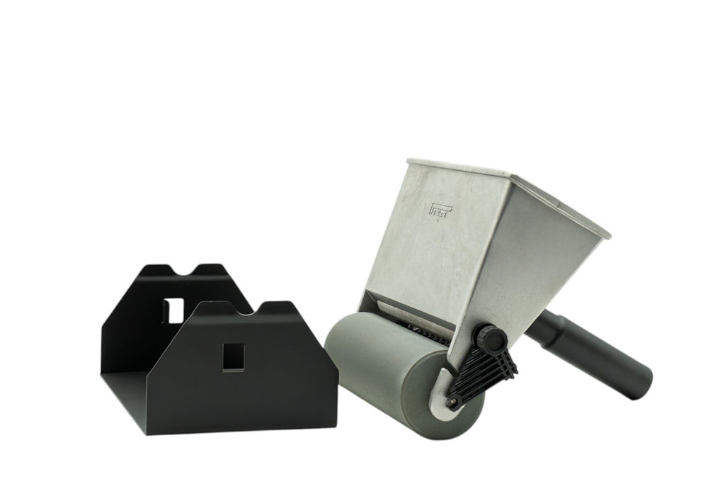 This well made 7″ cast aluminum roller type glue spreader holds a reserve of glue in the hopper with a internal metal roller for dispensing glue and a rubber roller underneath for spreading onto the panel.